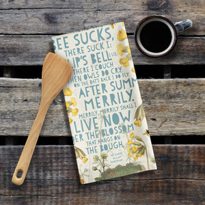 {"id":15142413336950,"title":"Tea towel Where the bee sucks, there suck I...The Tempest William Shakespeare","handle":"tea-towel-where-the-bee-sucks-there-suck-i-the-tempest-william-shakespeare","description":"\u003cp\u003eExtract from Ariel’s song in William Shakespeare’s The Tempest.\u003c\/p\u003e\n\u003cblockquote\u003e\n\u003cp\u003eWhere the bee sucks, there suck I:\u2028\u003cbr\u003eIn a cowslip's bell I lie; \u2028\u003cbr\u003eThere I couch when owls do cry. \u2028\u003cbr\u003eOn the bat's back I do fly \u2028\u003cbr\u003eAfter summer merrily.\u2028\u003cbr\u003eMerrily, merrily shall I live now \u2028\u003cbr\u003eUnder the blossom that hangs on the bough.\u003cbr\u003e\u003c\/p\u003e\n\u003c\/blockquote\u003e\n\u003cp\u003ePart of a new range of homeware designs launched for Spring 2025.\u003c\/p\u003e\n\u003cp\u003eThe tea towels are 47cm x 72cm and 100% drill natural organic cotton. There is a handy 'loop' on the top left corner of the tea towel so you can hang it up in your kitchen. \u003cspan\u003eSustainably printed in the UK on organic fabric using Azo dye free pigment inks. OEKO-TEX certified to European REACH standards. Recycled kraft card belly-band. \u003c\/span\u003e\u003cbr\u003e\u003c\/p\u003e\n\u003cul\u003e\n\u003cli\u003eHanging loop\u003c\/li\u003e\n\u003cli\u003e100% drill natural organic cotton\u003cbr\u003e\n\u003c\/li\u003e\n\u003cli\u003e47cm x 72cm\u003c\/li\u003e\n\u003cli\u003eMachine washable \u003cspan\u003eat \u003c\/span\u003e\u003cspan\u003e30 degrees C\u003c\/span\u003e\n\u003c\/li\u003e\n\u003cli\u003e\u003cspan\u003ePart of the Tea towel quote range\u003c\/span\u003e\u003c\/li\u003e\n\u003c\/ul\u003e","published_at":"2025-04-04T14:00:00+01:00","created_at":"2025-04-04T13:56:44+01:00","vendor":"A Blackbird Sang","type":"Tea-towel","tags":["Ariel","Bee","Bees","cowslips","Faire","Retail","Shakespeare","Tea-towel","The Tempest","Where the bee sucks","William Shakespeare","XBLD1208"],"price":1400,"price_min":1400,"price_max":1400,"available":true,"price_varies":false,"compare_at_price":null,"compare_at_price_min":0,"compare_at_price_max":0,"compare_at_price_varies":false,"variants":[{"id":55461931745654,"title":"Where the bee sucks","option1":"Where the bee sucks","option2":null,"option3":null,"sku":"TTOWEL18_WHERETHEBEESUCKS","requires_shipping":true,"taxable":true,"featured_image":{"id":74779814855030,"product_id":15142413336950,"position":1,"created_at":"2025-04-03T07:51:10+01:00","updated_at":"2025-04-04T14:02:04+01:00","alt":null,"width":1024,"height":1024,"src":"\/\/ablackbirdsang.com\/cdn\/shop\/files\/abs_teatowel_pegged_wherethebee_1024.jpg?v=1743771724","variant_ids":[55461931745654]},"available":true,"name":"Tea towel Where the bee sucks, there suck I...The Tempest William Shakespeare - Where the bee sucks","public_title":"Where the bee sucks","options":["Where the bee sucks"],"price":1400,"weight":200,"compare_at_price":null,"inventory_quantity":36,"inventory_management":"shopify","inventory_policy":"deny","barcode":"5060925566116","featured_media":{"alt":null,"id":64932656087414,"position":1,"preview_image":{"aspect_ratio":1.0,"height":1024,"width":1024,"src":"\/\/ablackbirdsang.com\/cdn\/shop\/files\/abs_teatowel_pegged_wherethebee_1024.jpg?v=1743771724"}},"requires_selling_plan":false,"selling_plan_allocations":[]}],"images":["\/\/ablackbirdsang.com\/cdn\/shop\/files\/abs_teatowel_pegged_wherethebee_1024.jpg?v=1743771724","\/\/ablackbirdsang.com\/cdn\/shop\/files\/all_teatowels_flat_folded_rough_square_1024_0016_wherethebee.jpg?v=1743771724","\/\/ablackbirdsang.com\/cdn\/shop\/files\/abs_teatowel_folded_wherethebee_1024.jpg?v=1743771724","\/\/ablackbirdsang.com\/cdn\/shop\/files\/HangingTeaTowels_onpegrack_sq_abs_newset.jpg?v=1743772884","\/\/ablackbirdsang.com\/cdn\/shop\/files\/HangingTeaTowels_onpegrack_sq_abs_newset_v2.jpg?v=1743772884"],"featured_image":"\/\/ablackbirdsang.com\/cdn\/shop\/files\/abs_teatowel_pegged_wherethebee_1024.jpg?v=1743771724","options":["Title"],"media":[{"alt":null,"id":64932656087414,"position":1,"preview_image":{"aspect_ratio":1.0,"height":1024,"width":1024,"src":"\/\/ablackbirdsang.com\/cdn\/shop\/files\/abs_teatowel_pegged_wherethebee_1024.jpg?v=1743771724"},"aspect_ratio":1.0,"height":1024,"media_type":"image","src":"\/\/ablackbirdsang.com\/cdn\/shop\/files\/abs_teatowel_pegged_wherethebee_1024.jpg?v=1743771724","width":1024},{"alt":null,"id":64949659533686,"position":2,"preview_image":{"aspect_ratio":1.0,"height":1024,"width":1024,"src":"\/\/ablackbirdsang.com\/cdn\/shop\/files\/all_teatowels_flat_folded_rough_square_1024_0016_wherethebee.jpg?v=1743771724"},"aspect_ratio":1.0,"height":1024,"media_type":"image","src":"\/\/ablackbirdsang.com\/cdn\/shop\/files\/all_teatowels_flat_folded_rough_square_1024_0016_wherethebee.jpg?v=1743771724","width":1024},{"alt":null,"id":64932655530358,"position":3,"preview_image":{"aspect_ratio":1.0,"height":1024,"width":1024,"src":"\/\/ablackbirdsang.com\/cdn\/shop\/files\/abs_teatowel_folded_wherethebee_1024.jpg?v=1743771724"},"aspect_ratio":1.0,"height":1024,"media_type":"image","src":"\/\/ablackbirdsang.com\/cdn\/shop\/files\/abs_teatowel_folded_wherethebee_1024.jpg?v=1743771724","width":1024},{"alt":null,"id":64932656284022,"position":4,"preview_image":{"aspect_ratio":1.0,"height":1024,"width":1024,"src":"\/\/ablackbirdsang.com\/cdn\/shop\/files\/HangingTeaTowels_onpegrack_sq_abs_newset.jpg?v=1743772884"},"aspect_ratio":1.0,"height":1024,"media_type":"image","src":"\/\/ablackbirdsang.com\/cdn\/shop\/files\/HangingTeaTowels_onpegrack_sq_abs_newset.jpg?v=1743772884","width":1024},{"alt":null,"id":64932655694198,"position":5,"preview_image":{"aspect_ratio":1.0,"height":1024,"width":1024,"src":"\/\/ablackbirdsang.com\/cdn\/shop\/files\/HangingTeaTowels_onpegrack_sq_abs_newset_v2.jpg?v=1743772884"},"aspect_ratio":1.0,"height":1024,"media_type":"image","src":"\/\/ablackbirdsang.com\/cdn\/shop\/files\/HangingTeaTowels_onpegrack_sq_abs_newset_v2.jpg?v=1743772884","