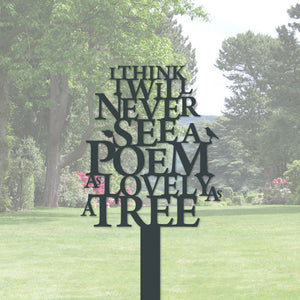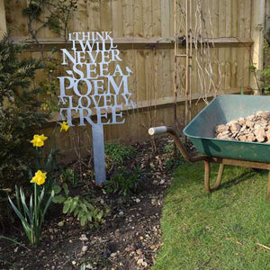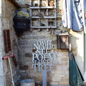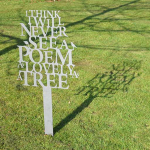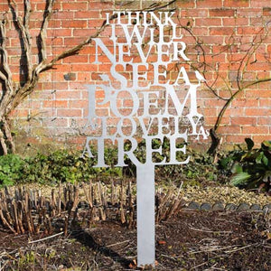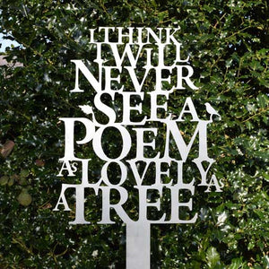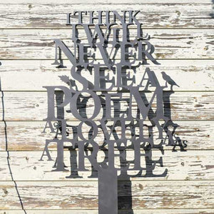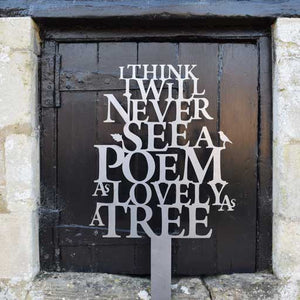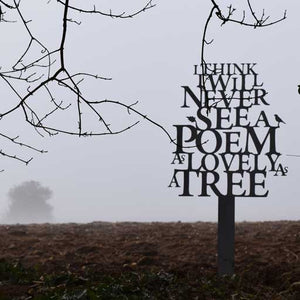 {"id":5764896519,"title":"Poem - Lovely as a tree","handle":"poem-lovely-as-a-tree","description":"\u003cmeta charset=\"utf-8\"\u003e\n\u003cp\u003eTwo lines from Joyce Kilmer's poem 'Trees' with incidental details integrated into the typography. \u003c\/p\u003e\n\u003cdiv id=\"solSDDiv\" class=\"fl w-660\"\u003e\n\u003cdiv itemscope=\"\" itemtype=\"http:\/\/schema.org\/CreativeWork\"\u003e\n\u003cdiv class=\"poem-detail\"\u003e\n\u003cdiv id=\"solSiirMetinDV\"\u003e\n\u003cdiv class=\"KonaBody\"\u003e\n\u003cblockquote\u003e\n\u003cp\u003eI think that I shall never see \u003cbr\u003eA poem lovely as a tree.\u003c\/p\u003e\n\u003c\/blockquote\u003e\n\u003c\/div\u003e\n\u003c\/div\u003e\n\u003c\/div\u003e\n\u003c\/div\u003e\n\u003c\/div\u003e\n\u003cp\u003eJoyce Kilmer (born as Alfred Joyce Kilmer; December 6, 1886 – July 30, 1918) was an American writer and poet mainly remembered for a short poem titled \"Trees\" (1913), which was published in the collection Trees and Other Poems in 1914. Many writers, including notably Ogden Nash, have parodied Kilmer's work and style—as attested by the many parodies of \"Trees\".\u003c\/p\u003e\n\u003cmeta charset=\"utf-8\"\u003e\n\u003cp\u003eThis looks fantastic in a small garden where natural trees may not be possible or against a wall or wooden fence. The shadow thrown by the poem adds an extra dimension. \u003c\/p\u003e\n\u003cmeta charset=\"utf-8\"\u003e\n\u003cp\u003e\u003cspan\u003eAvailable as single pieces in mild steel.\u003c\/span\u003e\u003c\/p\u003e\n\u003cp\u003eSuitable for outdoor setting.\u003c\/p\u003e\n\u003cp\u003eAll dimensions approximate.\u003c\/p\u003e\n\u003cp\u003eStandard Size: 512 x 1084 x 3mm\u003cbr\u003eExtra Large Size: 768 x 1626 x 3mm\u003c\/p\u003e\n\u003cp\u003eMaterial: Mild Steel\u003c\/p\u003e","published_at":"2016-03-24T17:26:00+00:00","created_at":"2016-03-24T17:45:00+00:00","vendor":"A Blackbird Sang","type":"Poetry \u0026 Quotes","tags":["nrt","Poetry","Quote","Typography"],"price":14500,"price_min":14500,"price_max":15500,"available":false,"price_varies":true,"compare_at_price":14500,"compare_at_price_min":14500,"compare_at_price_max":15500,"compare_at_price_varies":true,"variants":[{"id":18227942343,"title":"Standard \/ Silver","option1":"Standard","option2":"Silver","option3":null,"sku":"TYPE02SILV","requires_shipping":true,"taxable":true,"featured_image":{"id":10674044231,"product_id":5764896519,"position":1,"created_at":"2016-03-24T17:56:45+00:00","updated_at":"2016-03-25T16:00:07+00:00","alt":null,"width":512,"height":512,"src":"\/\/ablackbirdsang.com\/cdn\/shop\/products\/mvo_product_poem_tree_naturalsteel_standard.jpg?v=1458921607","variant_ids":[18227942343]},"available":false,"name":"Poem - Lovely as a tree - Standard \/ Silver","public_title":"Standard \/ Silver","options":["Standard","Silver"],"price":14500,"weight":2800,"compare_at_price":14500,"inventory_quantity":0,"inventory_management":"shopify","inventory_policy":"deny","barcode":"5060925563405","featured_media":{"alt":null,"id":94754013246,"position":1,"preview_image":{"aspect_ratio":1.0,"height":512,"width":512,"src":"\/\/ablackbirdsang.com\/cdn\/shop\/products\/mvo_product_poem_tree_naturalsteel_standard.jpg?v=1458921607"}},"requires_selling_plan":false,"selling_plan_allocations":[]},{"id":21575378951,"title":"Standard \/ DarkGrey","option1":"Standard","option2":"DarkGrey","option3":null,"sku":"TYPE03DKGRY","requires_shipping":true,"taxable":true,"featured_image":{"id":13026507399,"product_id":5764896519,"position":15,"created_at":"2016-05-25T11:47:30+01:00","updated_at":"2016-05-25T11:47:30+01:00","alt":null,"width":512,"height":512,"src":"\/\/ablackbirdsang.com\/cdn\/shop\/products\/mvo_product_poem_tree_ral8019_standard_02f45937-85eb-4cfe-99cb-16d2e42012a1.jpg?v=1464173250","variant_ids":[21575378951]},"available":false,"name":"Poem - Lovely as a tree - Standard \/ DarkGrey","public_title":"Standard \/ DarkGrey","options":["Standard","DarkGrey"],"price":15500,"weight":2800,"compare_at_price":15500,"inventory_quantity":0,"inventory_management":"shopify","inventory_policy":"deny","barcode":"5060925563412","featured_media":{"alt":null,"id":94754471998,"position":15,"preview_image":{"aspect_ratio":1.0,"height":512,"width":512,"src":"\/\/ablackbirdsang.com\/cdn\/shop\/products\/mvo_product_poem_tree_ral8019_standard_02f45937-85eb-4cfe-99cb-16d2e42012a1.jpg?v=1464173250"}},"requires_selling_plan":false,"selling_plan_allocations":[]}],"images":["\/\/ablackbirdsang.com\/cdn\/shop\/products\/mvo_product_poem_tree_naturalsteel_standard.jpg?v=1458921607","\/\/ablackbirdsang.com\/cdn\/shop\/products\/mvo_product_poem_tree_enclosedgardenwall.jpg?v=1458921607","\/\/ablackbirdsang.com\/cdn\/shop\/products\/mvo_product_poem_tree_againstholly.jpg?v=1458921607","\/\/ablackbirdsang.com\/cdn\/shop\/products\/mvo_product_poem_tree_inthewoods.jpg?v=1458921607","\/\/ablackbirdsang.com\/cdn\/shop\/products\/mvo_product_poem_tree_intheborder.jpg?v=1458921607","\/\/ablackbirdsang.com\/cdn\/shop\/products\/mvo_product_poem_tree_enclosedgardenwall_964b8262-12f8-4222-bfc4-6dc4378e90aa.jpg?v=1458921607","\/\/ablackbirdsang.com\/cdn\/shop\/products\/mvo_product_poem_tree_bythebackdoor.jpg?v=1458921607","\/\/ablackbirdsang.com\/cdn\/shop\/products\/mvo_product_poem_tree_onthelawn.jpg?v=1458921607","\/\/ablackbirdsang.com\/cdn\/shop\/products\/mvo_product_poem_tree_andthewindow.jpg?v=1458921607","\/\/ablackbirdsang.com\/cdn\/shop\/products\/mvo_scale_diag_poem_tree_1024px.jpg?v=1458921607","\/\/ablackbirdsang.com\/cdn\/shop\/products\/mvo_product_poem_tree_ral7015_standard.jpg?v=1458921964","\/\/ablackbirdsang.com\/cdn\/shop\/products\/mvo_product_poem_tree_ral7015_extralarge.jpg?v=1458921979","\/\/ablackbirdsang.com\/cdn\/shop\/products\/mvo_product_poem_tree_ralxxxx.jpg?v=1458922292","\/\/ablackbirdsang.com\/cdn\/shop\/products\/mvo_product_poem_tree_ral8019_standard.jpg?v=1464173233","\/\/ablackbirdsang.com\/cdn\/shop\/products\/mvo_product_poem_tree_ral8019_st